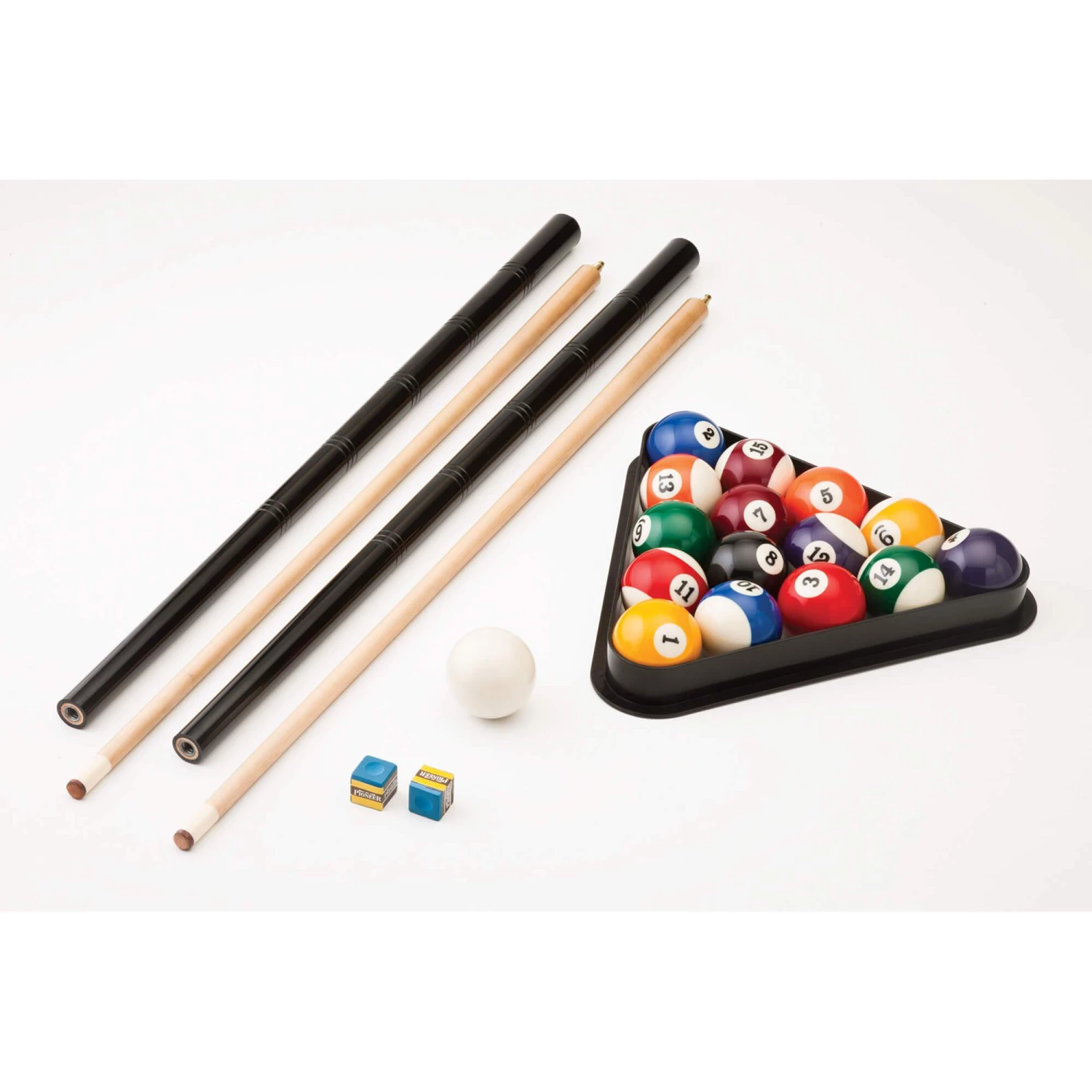 - Includes two pieces of chalk, one resin triangle, two 57” cues, one rail brush, and once complete set of 2.25” billiard balls.