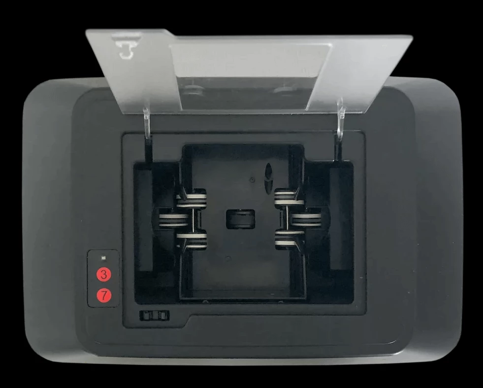 - Cards eject from the top tray rather than the side presentation tray. [Switch on bottom of machine changes machine from table-top mode to flush mount mode.]