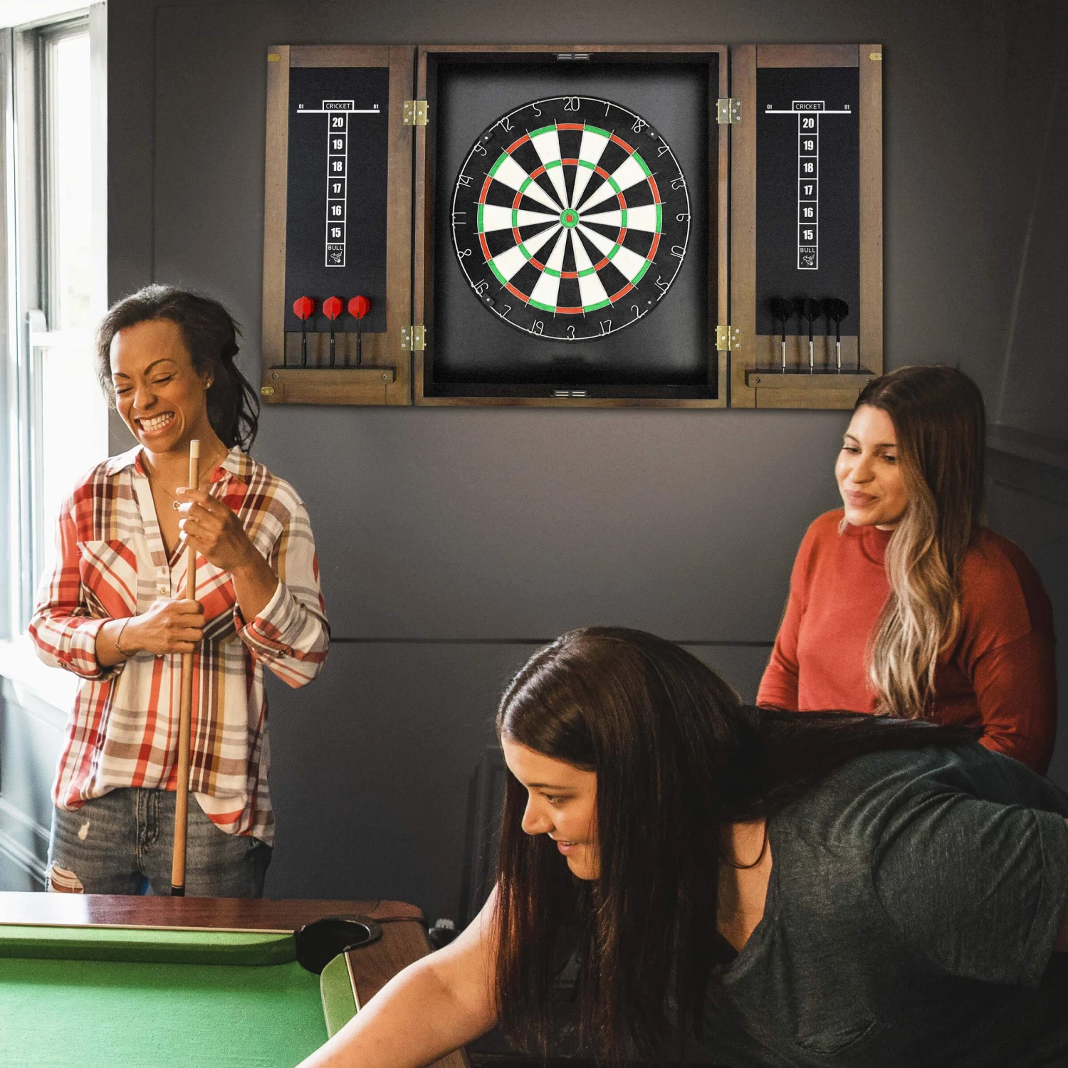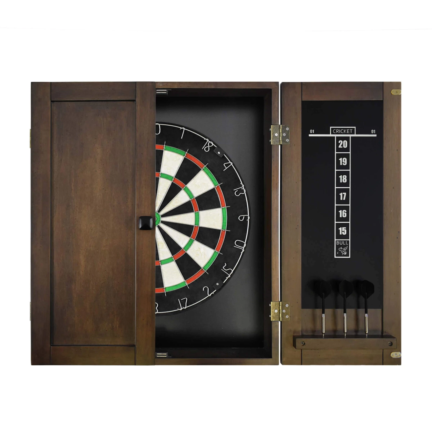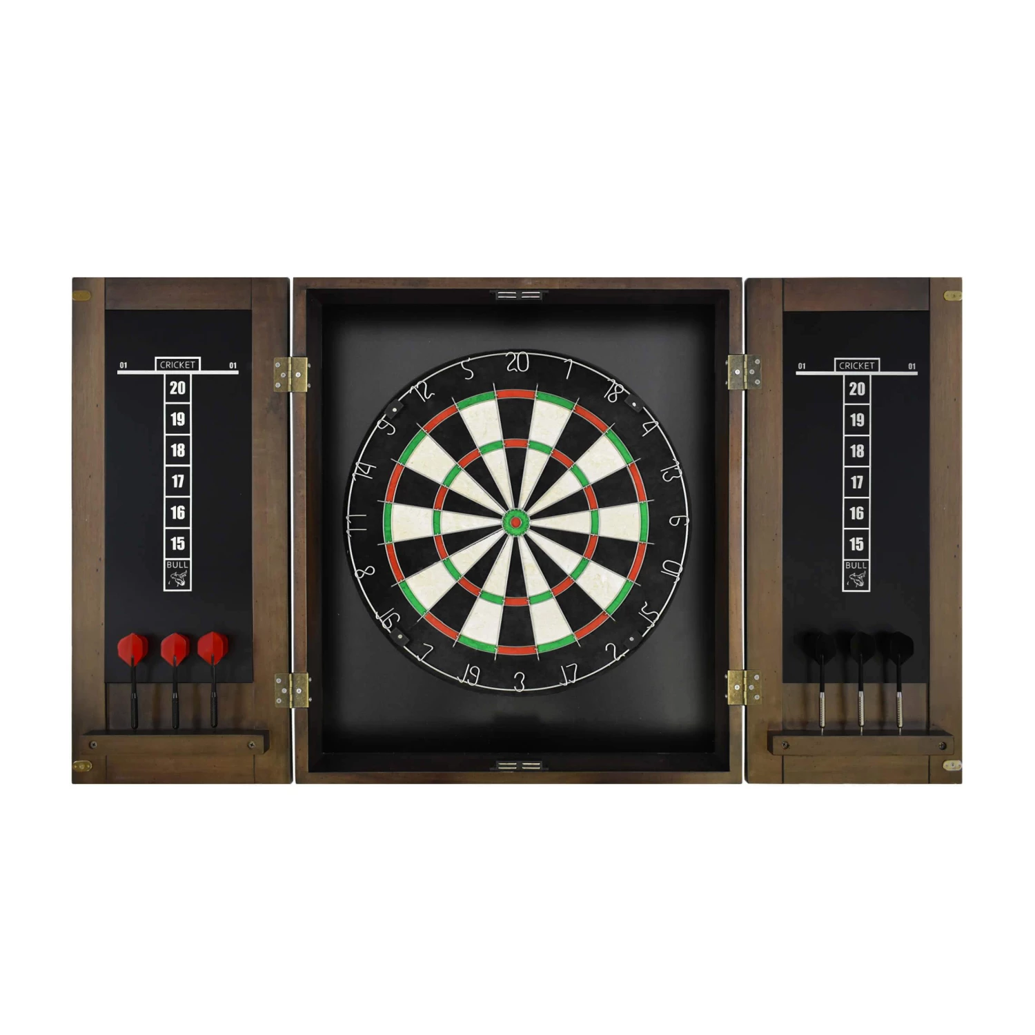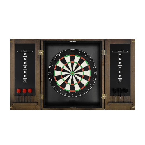 - Assembly is simple; just attach the dartboard to the inside of the cabinet, mount the cabinet to the wall of your choice, and you’re ready to play.