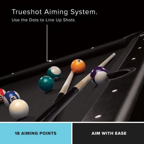 For quick and easy fun, there’s none better than the Trueshot Billiard Table with foldable legs. This innovative design couples compact design with surprising portability. For those that are tight on space and want to enjoy their favorite classic table game, the Trueshot is the perfect solution! Featuring high strength material means not sacrificing quality for space, as the surface of the Trueshot table will be sure to play smooth and fast. Featuring a sleek black cloth design, this table will complement any decor. The included Play Package features a full set of 2.25″ billiard balls, two 57″ cues, triangle and table brush to get you started playing out of the box.