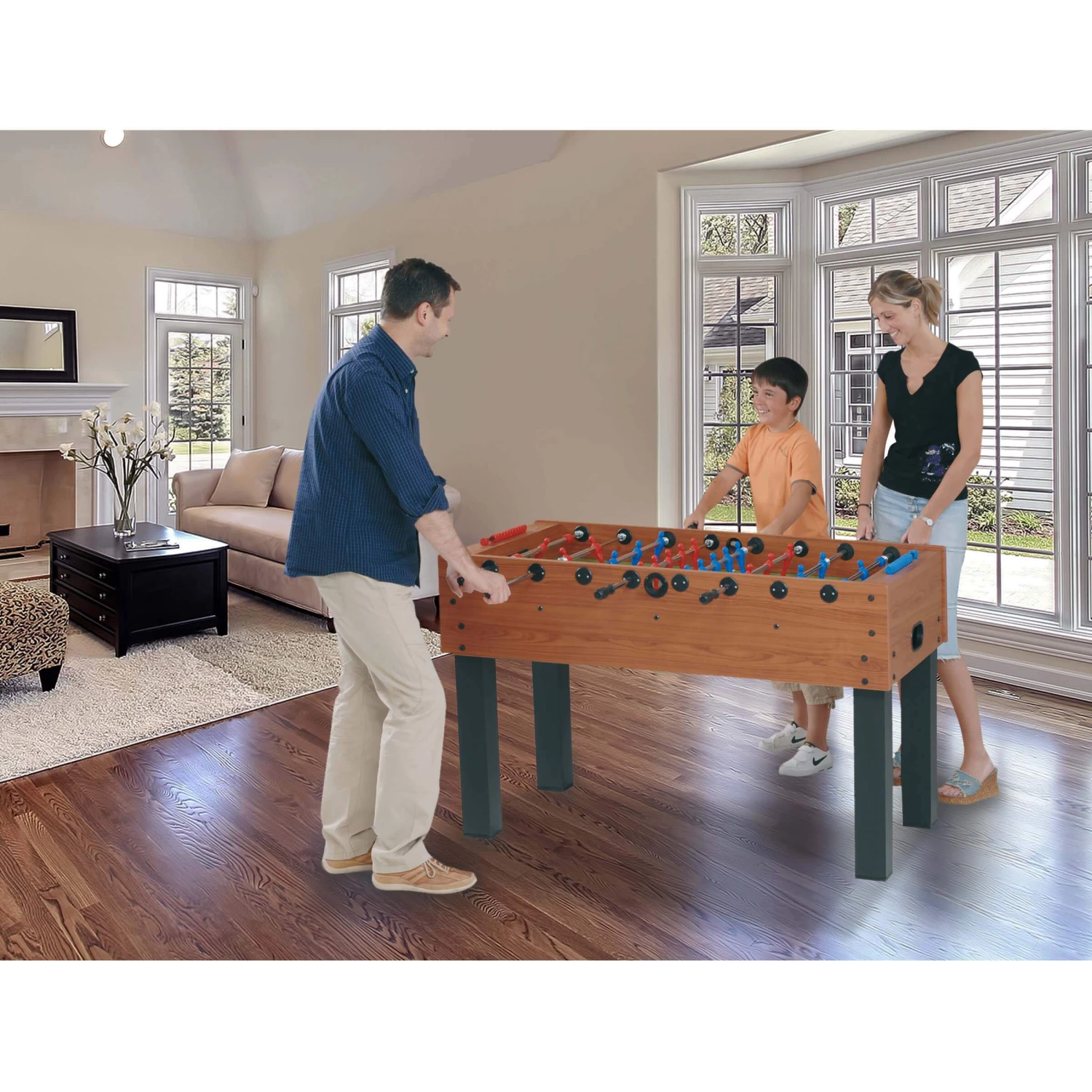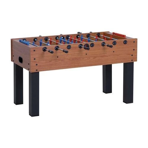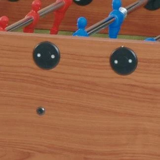 The Garlando F-100 Foosball Table has a sturdy 1-inch thick MDF cabinet with cherrywood melamine coating to protect against scratching and marring. 4-inch square MDF legs with black melamine coating provides stability during aggressive play. The 2’3-inch diameter telescopic rods are made of high resistance steel with anti-rust chromium plating. Nylon bushings reduce wear and tear. MDF playing field with a melamine coating has a “grass” effect gives the impression of playing on a futbol pitch. Quick and easy ball recovery through an exit behind each goal. Red and blue unbreakable plastic players are molded directly onto the rods. Fully rotating (360 degree) goalkeeper for easier scoring. Includes 3 standard white balls. 2 year warranty against manufacturer defects.