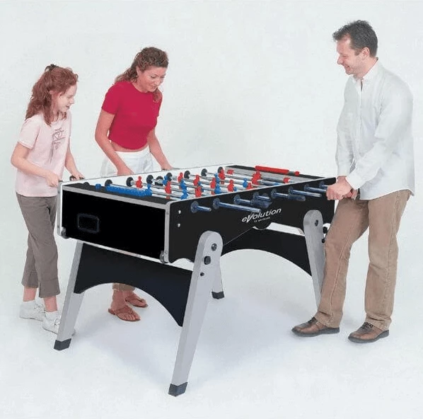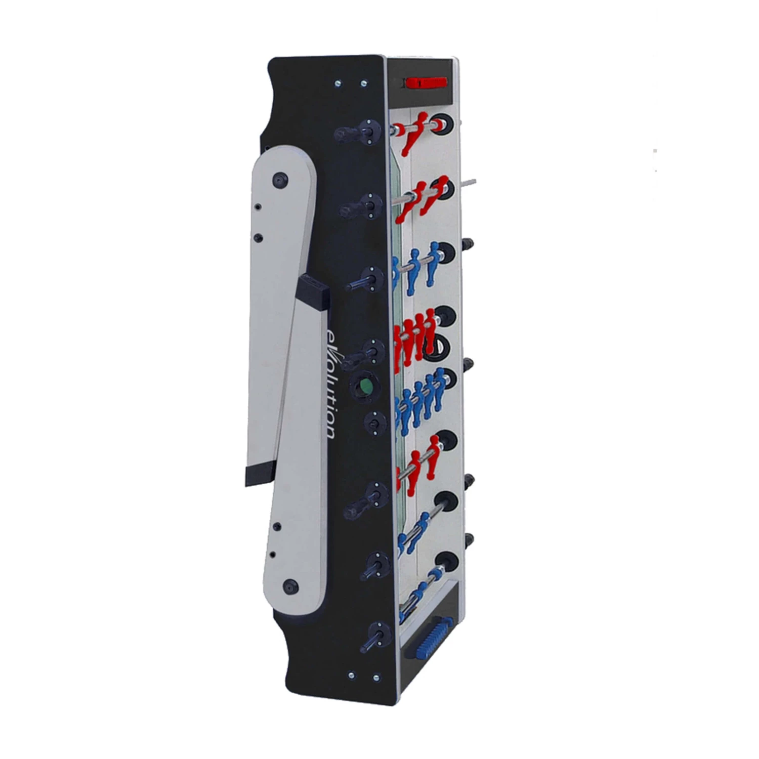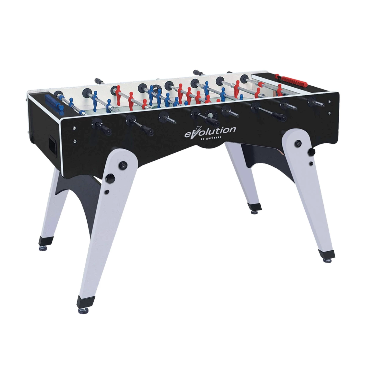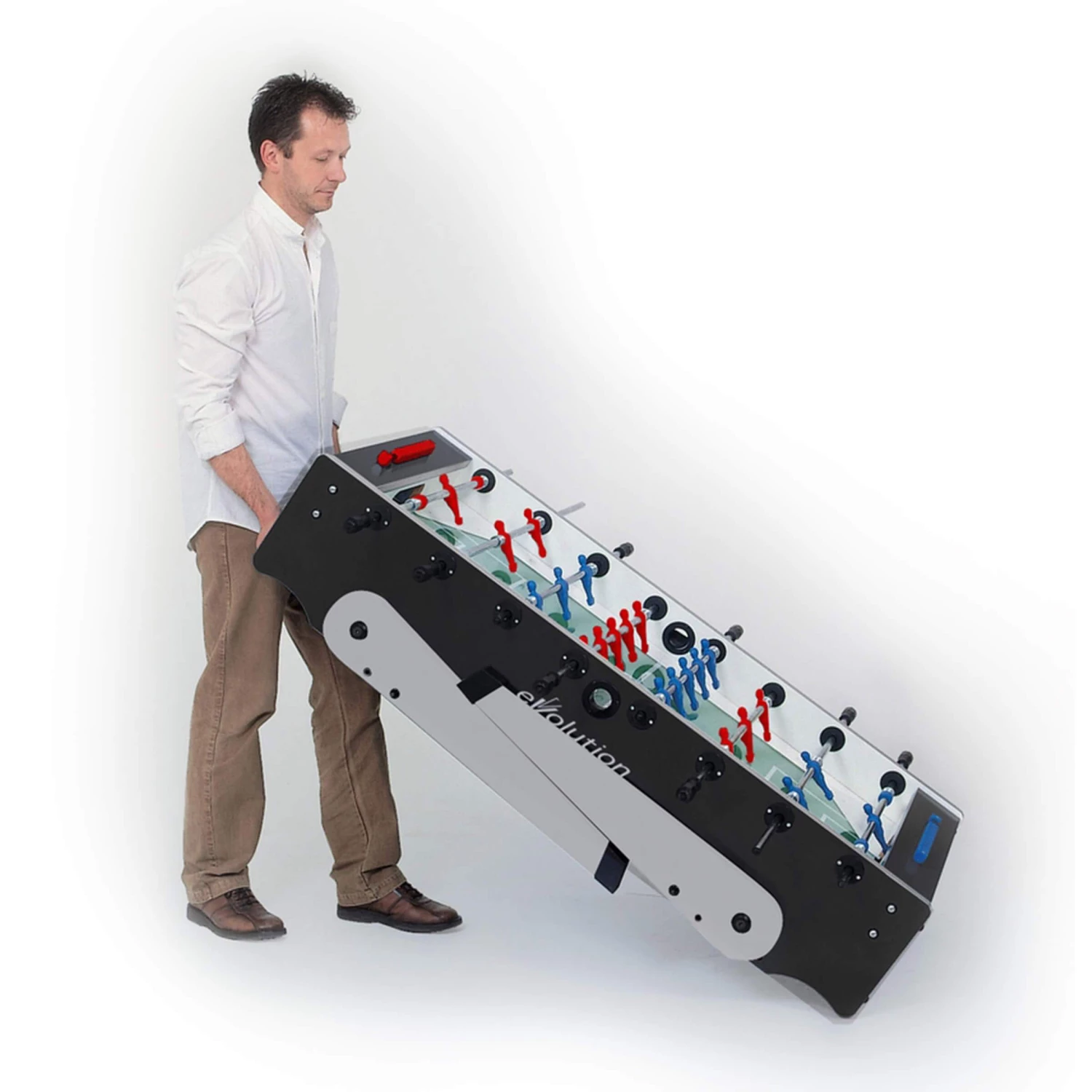 A classy foosball table in silver and black, featuring folding legs for space saving. Ideal for locations where it is not possible to give the table a room of its’ own, can be readily stored. The cabinet has two wheels, that once the legs are folded, allow for easy displacing. Leg levellers allow to obtain a perfectly even flat playfield on uneven floors or rough terrains. The red and blue players and ergonomic handles, besides the black cabinet with logo Evolution and silver coated legs, distinguish this table from the classic model with blue cabinet.