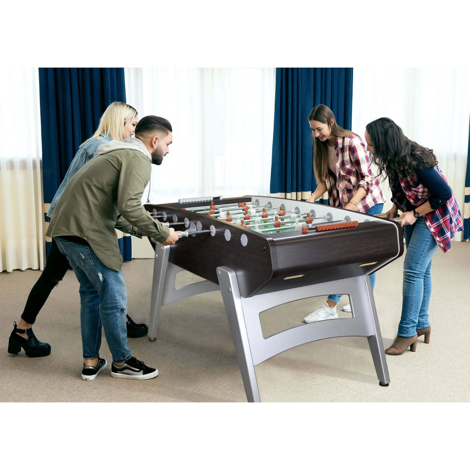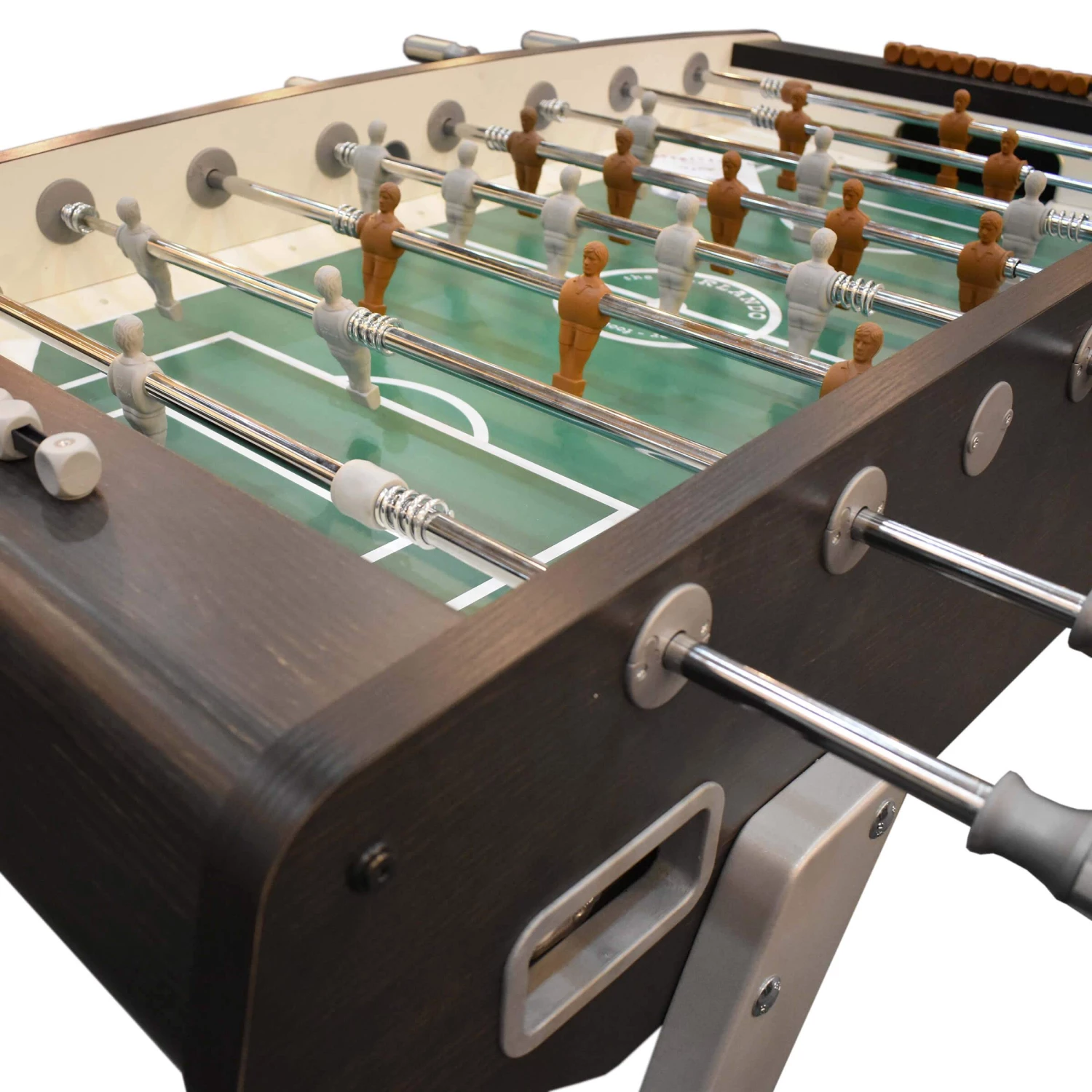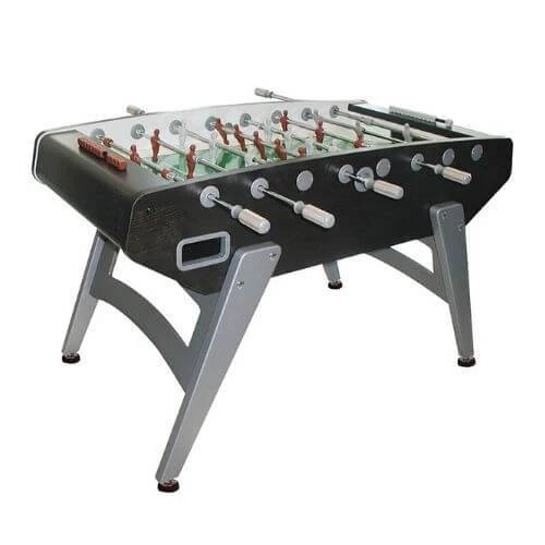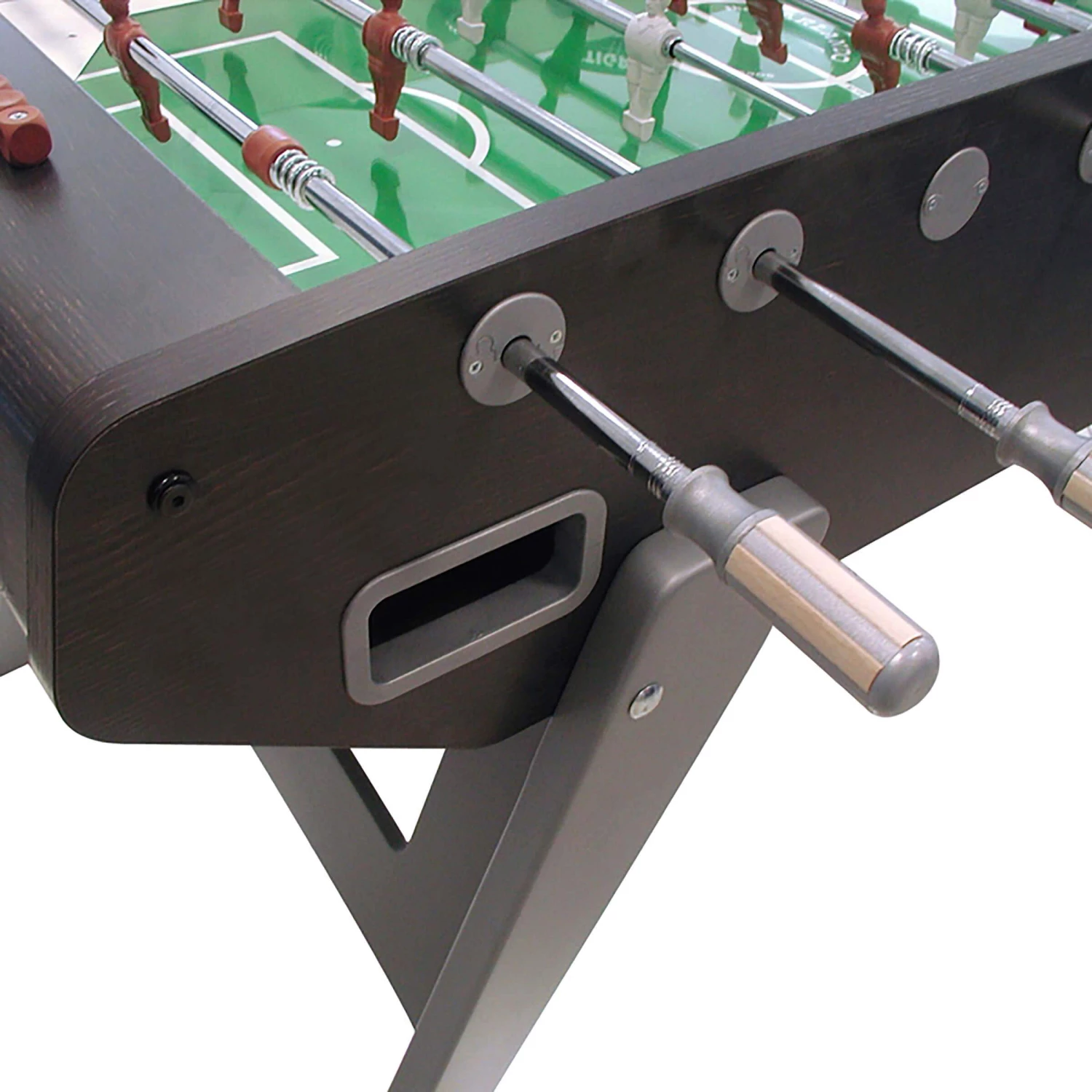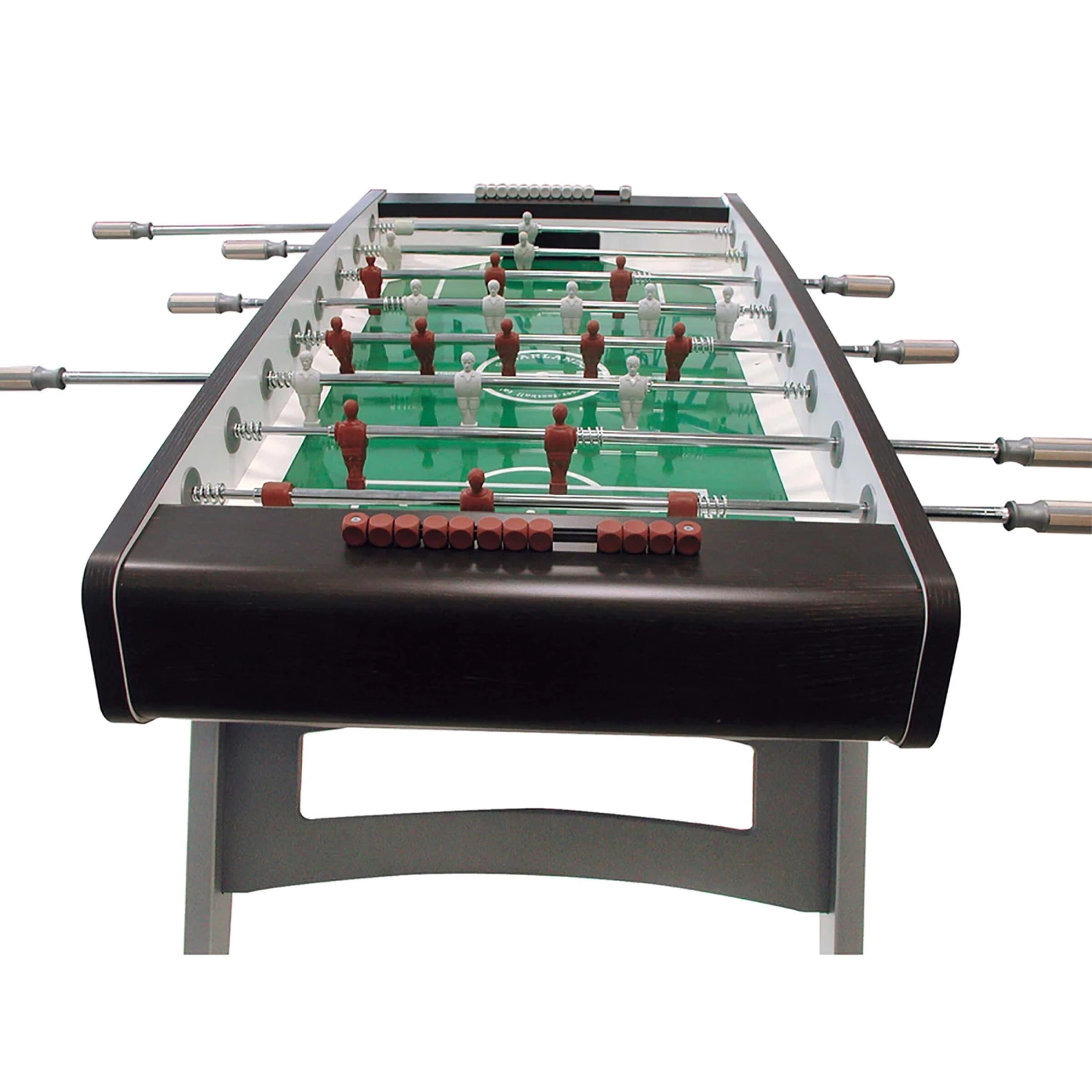The Garlando G-5000 Foosball Table is the top-of-the-line non-coin operated model. This table is constructed with the highest quality materials to ensure years of competitive play. The table has 1 1/2- inch thick cabinet walls with a plastic laminate finish to keep the finish looking great for years. The playing field is a plastic laminate with green background and white lines to look like a soccer field. 1 1/2 – inch thick, lacquered beech wood legs are slanted to provide great stability. Telescoping rods are made of 2/3″ diameter stress resistant steel with an anti-rust chromium-plating. Steel roller bearings improve game speed while reducing wrist stress. Grey and brown players are made of unbreakable plastic that are molded onto the bars. Professional plastic handles with wooden inserts are designed to reduce perspiration and improve grip. Other features include inside goals coated with felt material to reduce noise and prevent ball chipping and bouncing off, easy quick ball retrieval through returns on both sides of the cabinet, and leg levelers to provide a perfectly flat playing field.