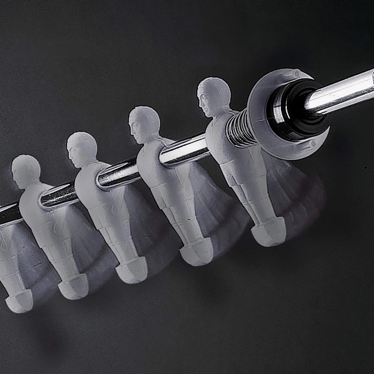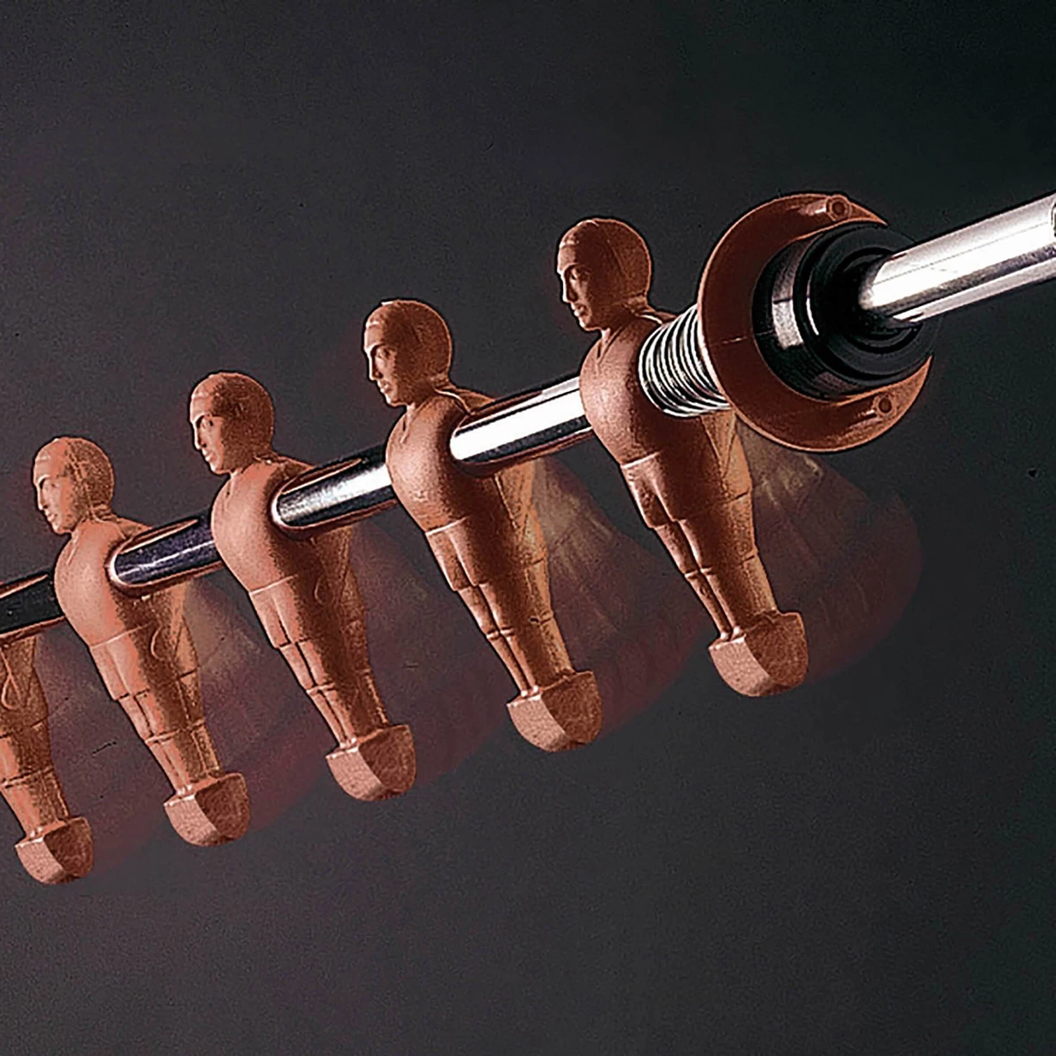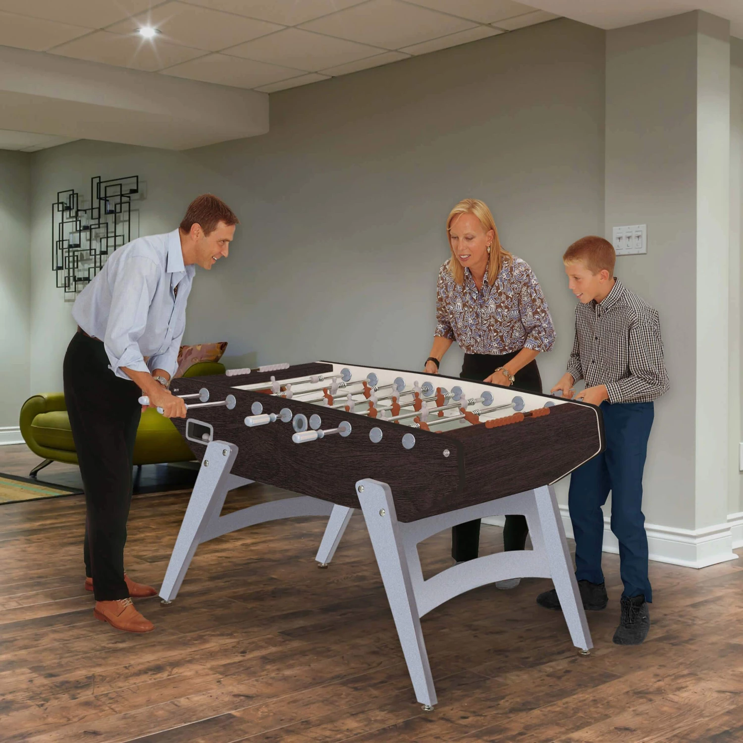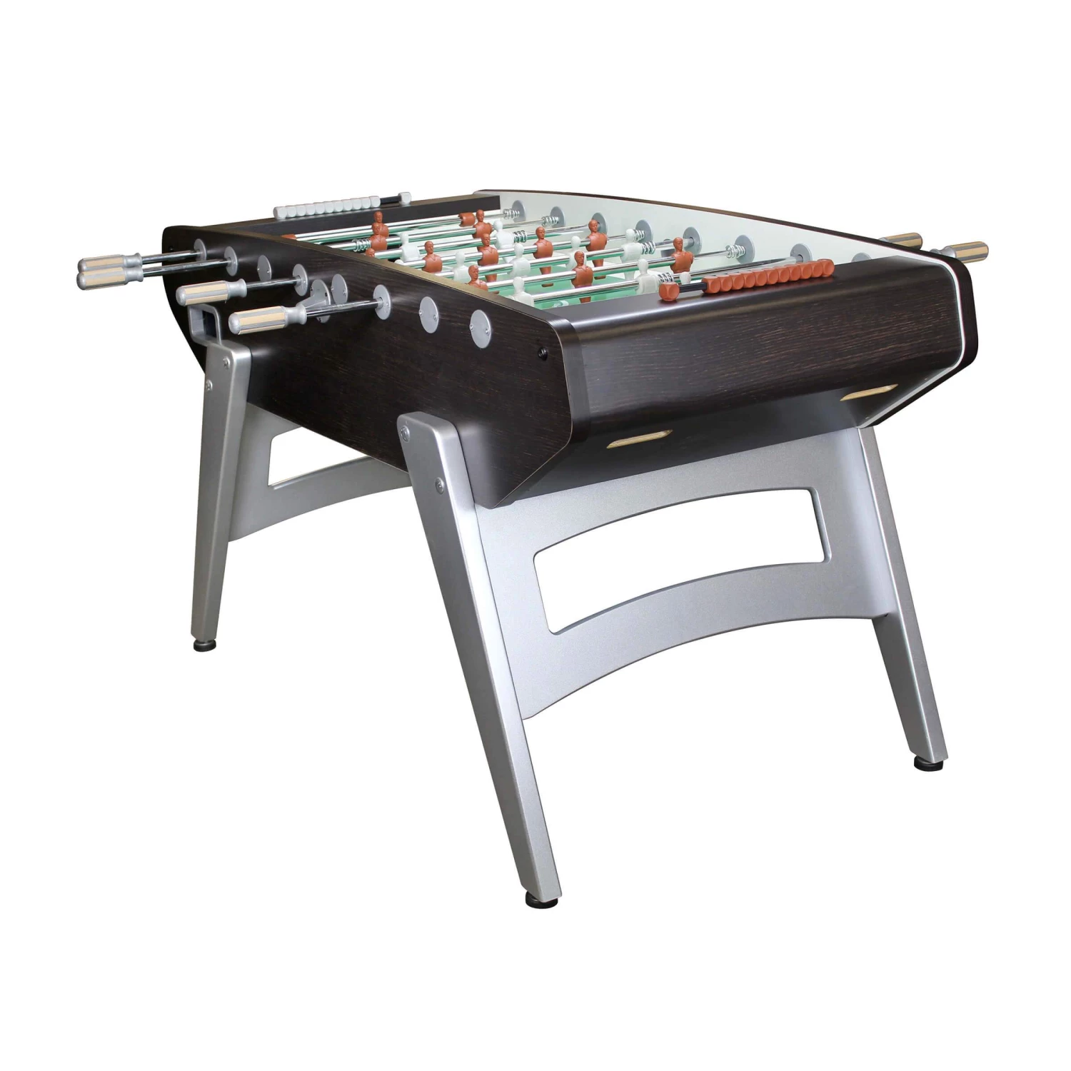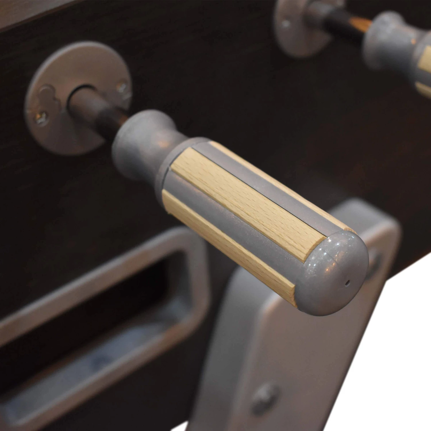 The Garlando G-5000 Foosball Table is the top-of-the-line non-coin operated model. This table is constructed with the highest quality materials to ensure years of competitive play. The table has 1 1/2- inch thick cabinet walls with a plastic laminate finish to keep the finish looking great for years. The playing field is a plastic laminate with green background and white lines to look like a soccer field. 1 1/2 – inch thick, lacquered beech wood legs are slanted to provide great stability. Telescoping rods are made of 2/3″ diameter stress resistant steel with an anti-rust chromium-plating. Steel roller bearings improve game speed while reducing wrist stress. Grey and brown players are made of unbreakable plastic that are molded onto the bars. Professional plastic handles with wooden inserts are designed to reduce perspiration and improve grip. Other features include inside goals coated with felt material to reduce noise and prevent ball chipping and bouncing off, easy quick ball retrieval through returns on both sides of the cabinet, and leg levelers to provide a perfectly flat playing field.
