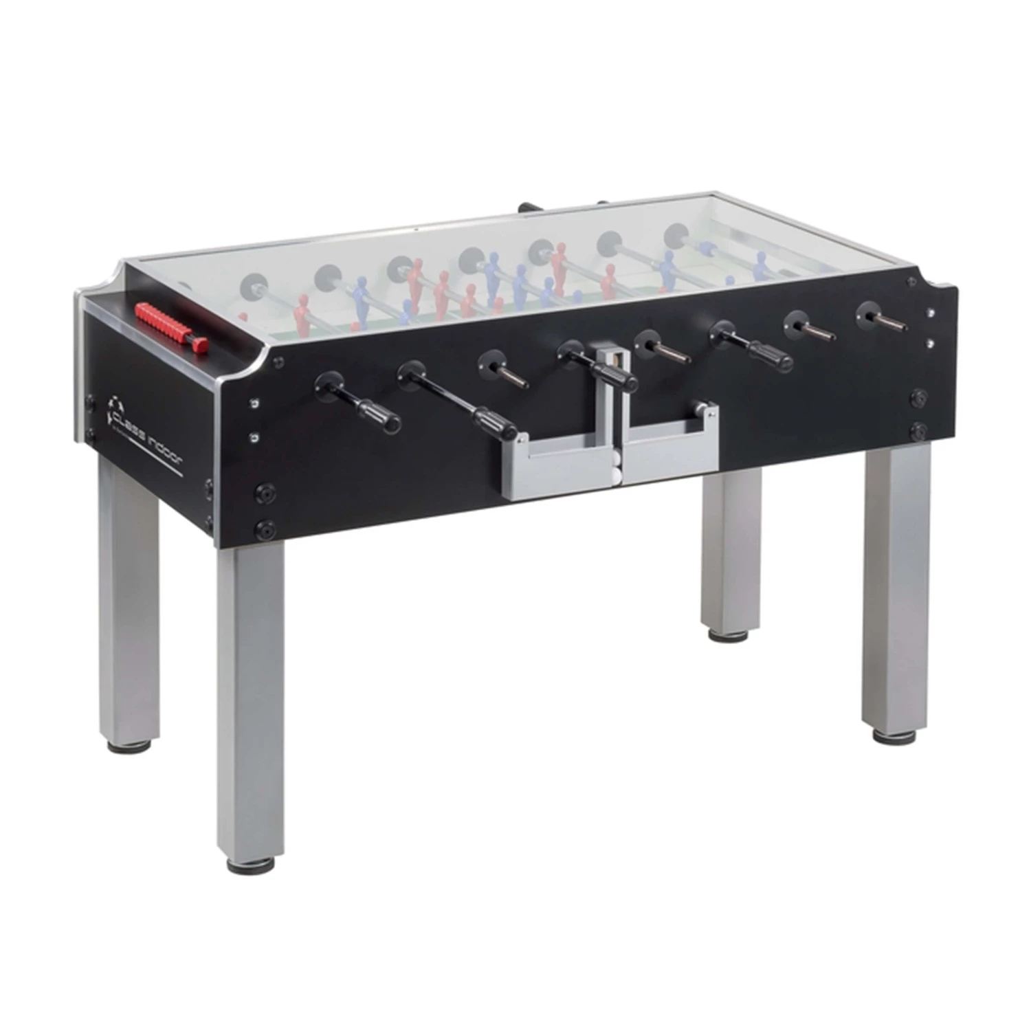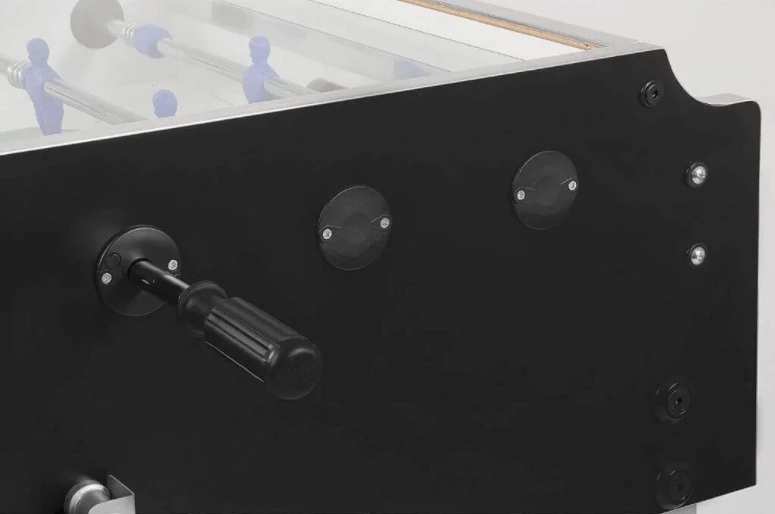 The first home Garlando foosball table with top glass. The balls remain inside the playfield area and cannot be lost of stolen. They are conveyed into the playfield by an external device and stay inside all the game long. Matches are quieter as the glass softens the game noises. The playfield stays cleaner longer.