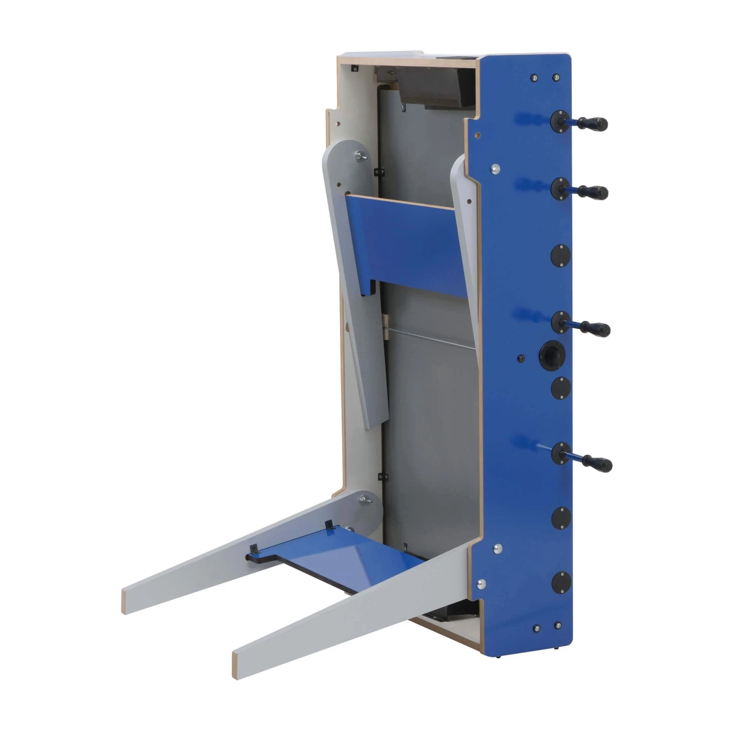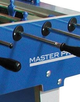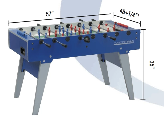 The Garlando Master Pro Indoor Foosball Table is designed for aggressive play and easy storage. The cabinet is made of 3/4-inch melamine coated MDF to reduce scratching and marring. The 1-1/8″ legs are melamine coated MDF and fold under the cabinet to reduce storage when not in use. 2/3-inch diameter telescopic high resistance steel bars have an anti-rust chromium plating. Steel roller ball bearings greatly improve game speed and reduce the stress on the players’ wrist. The play field is tempered glass with green background and white lines to look like a futbol pitch. Quick and easy ball recovery through an exit behind each goal. Cube score counters in colors matching the players colors. One-color, molded plastic players in a stylized human figure are molded directly to the bars so they do not move and maintain their positions perfectly. Includes 10 standard white balls.