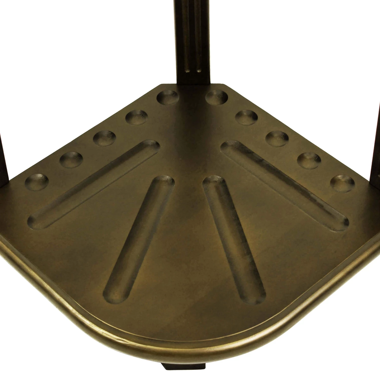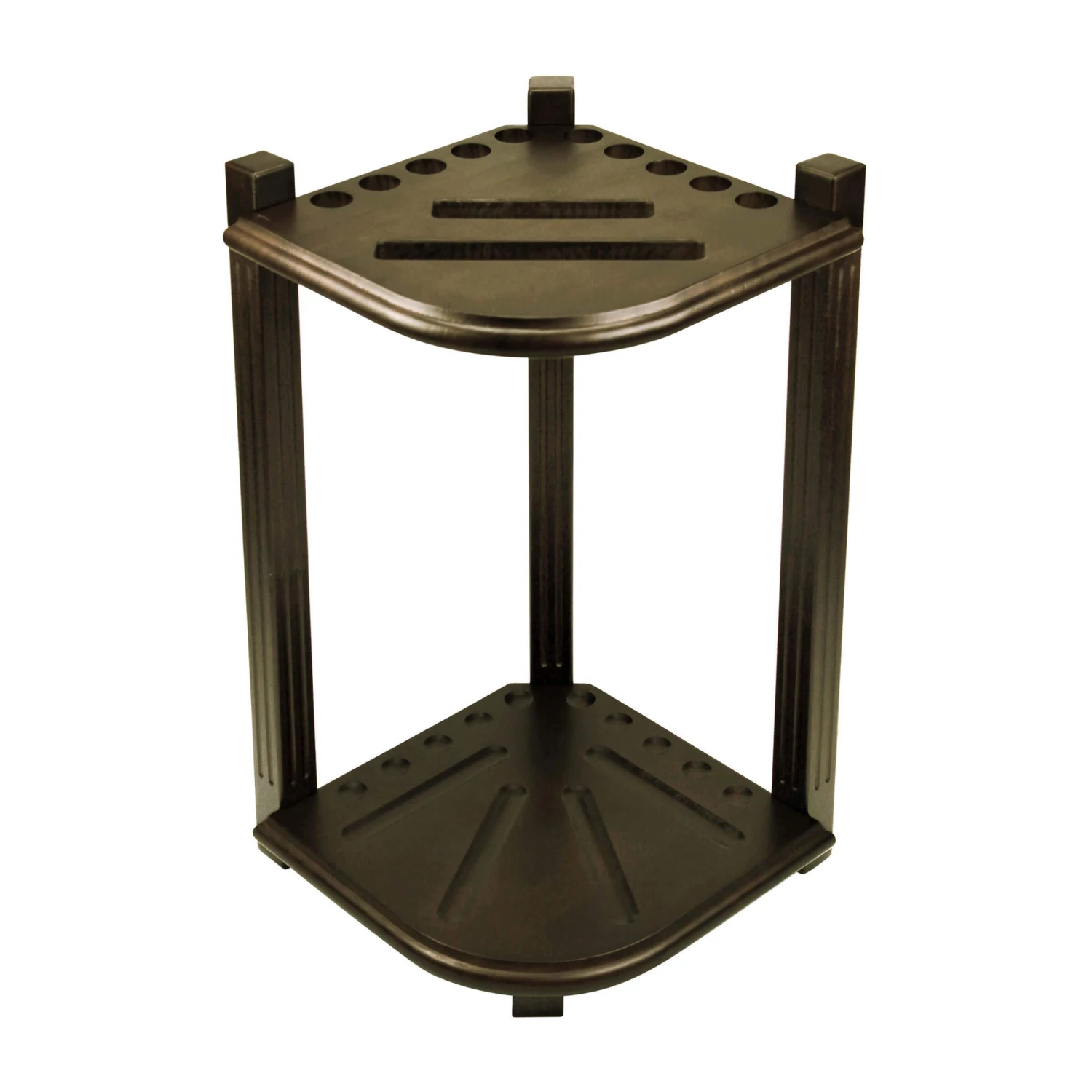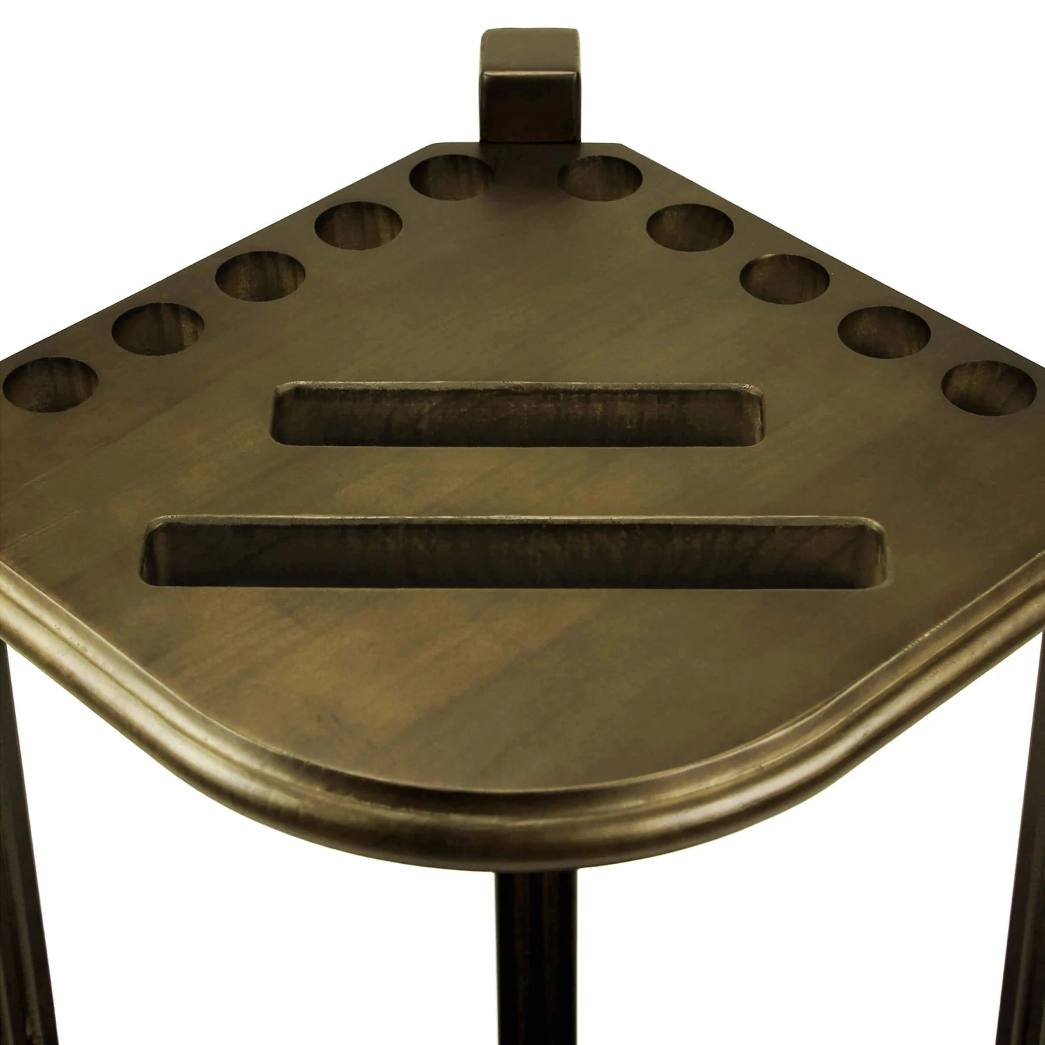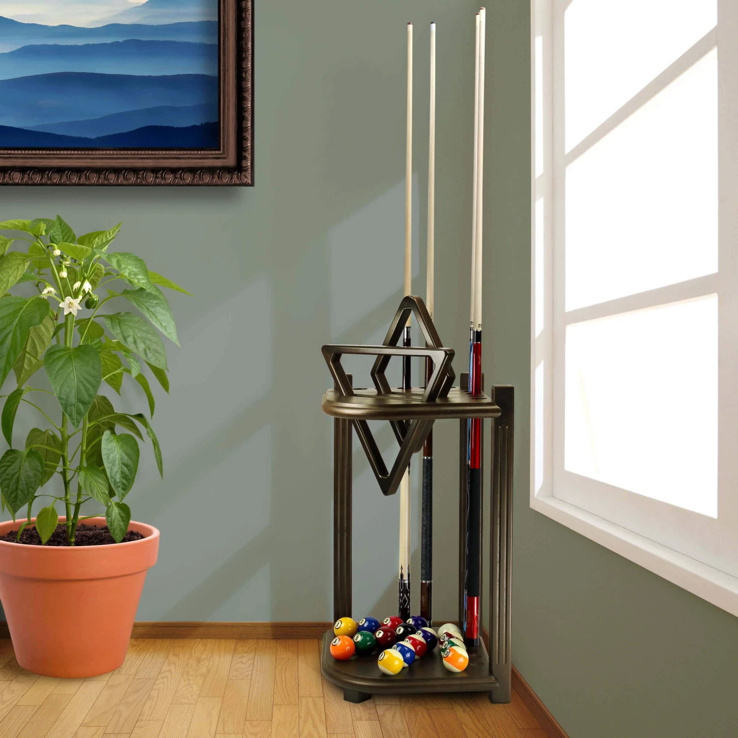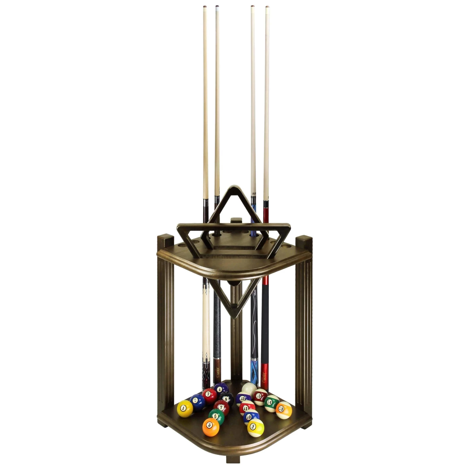 Solid wood corner cue rack with double thick design and a Cappuccino finish. The top of the rack has slots to hold the triangle and 9 ball rack. Measures 15″ x 15″ x 28″ high. Holds a set of balls and 10 cues.