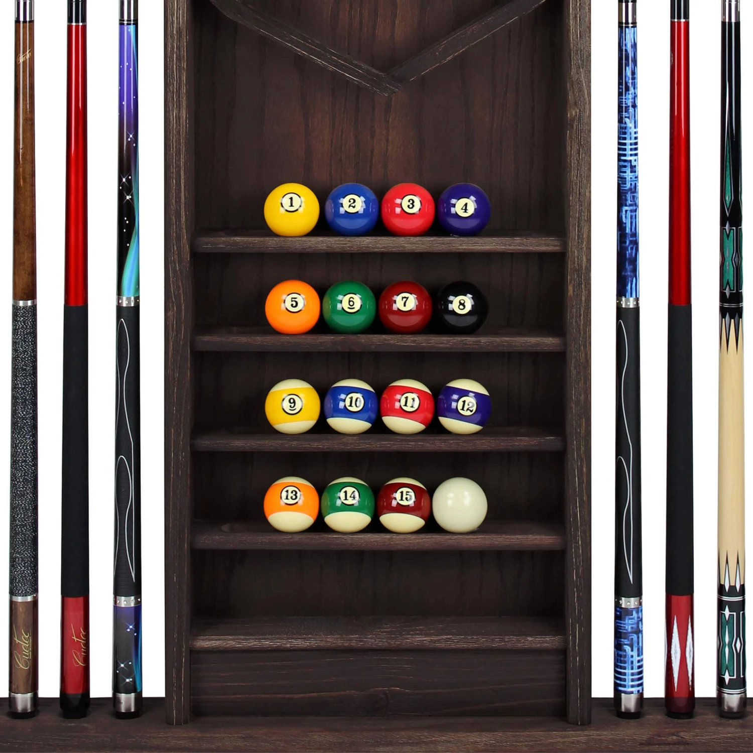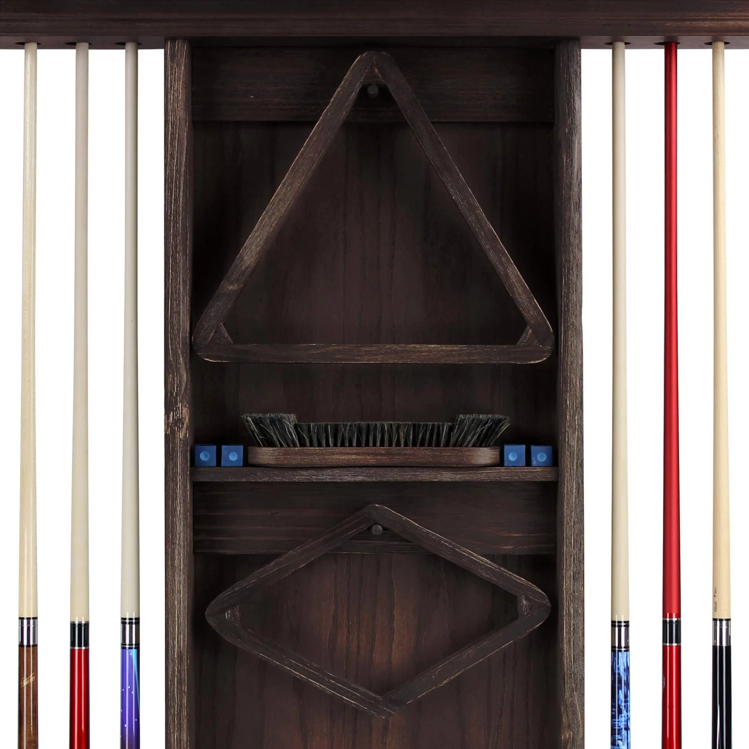 This Imperial Reno Deluxe Wall Rack is a beautifully designed, solid wood wall rack in a Desert Chestnut finish. This rack holds 8 cues, a set of balls, triangle, and a 9-ball rack. Measures 35.5-inches wide x 58-inches high x 4.5-inches deep.