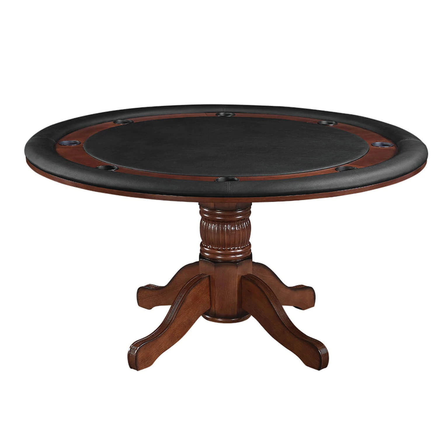 A gorgeous game table finished in classic chestnut. Solid wood construction with a padded vinyl playing surface. Your cards will elegantly slide across this surface, or you can flip the top for a perfect dining top option.