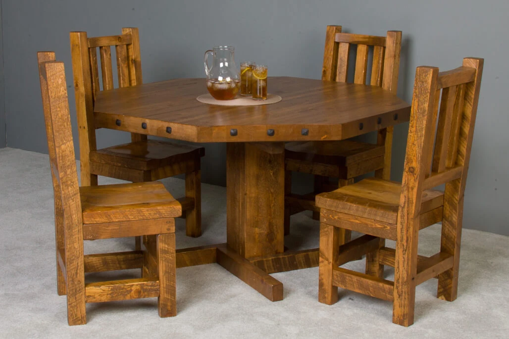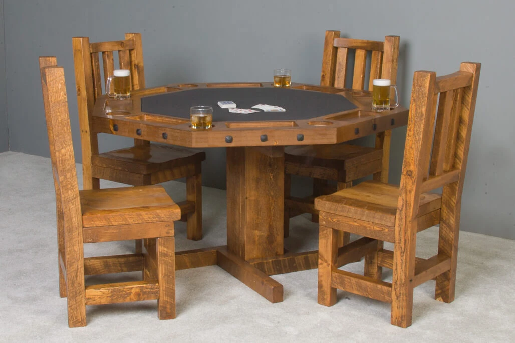 This rustic barnwood poker table will be a wonderful addition to your game room. This barn wood poker table is built as a multi-purpose table with one side being the card table and one side being the dining table. Each rustic poker table top has eight cup holders, with cork inserts, and chip trays router-ed out. The table top is two-inch thick and is built out of Ponderosa pine but stained to match the barnwood furniture. The poker table top is stocked with charcoal felt to match the one-inch clavos nails, but you can select your choice of felt to match any other game table or decor in your home as well. When you are not playing cards, just flip this table top over and you will have a smooth dining table.