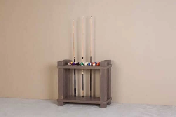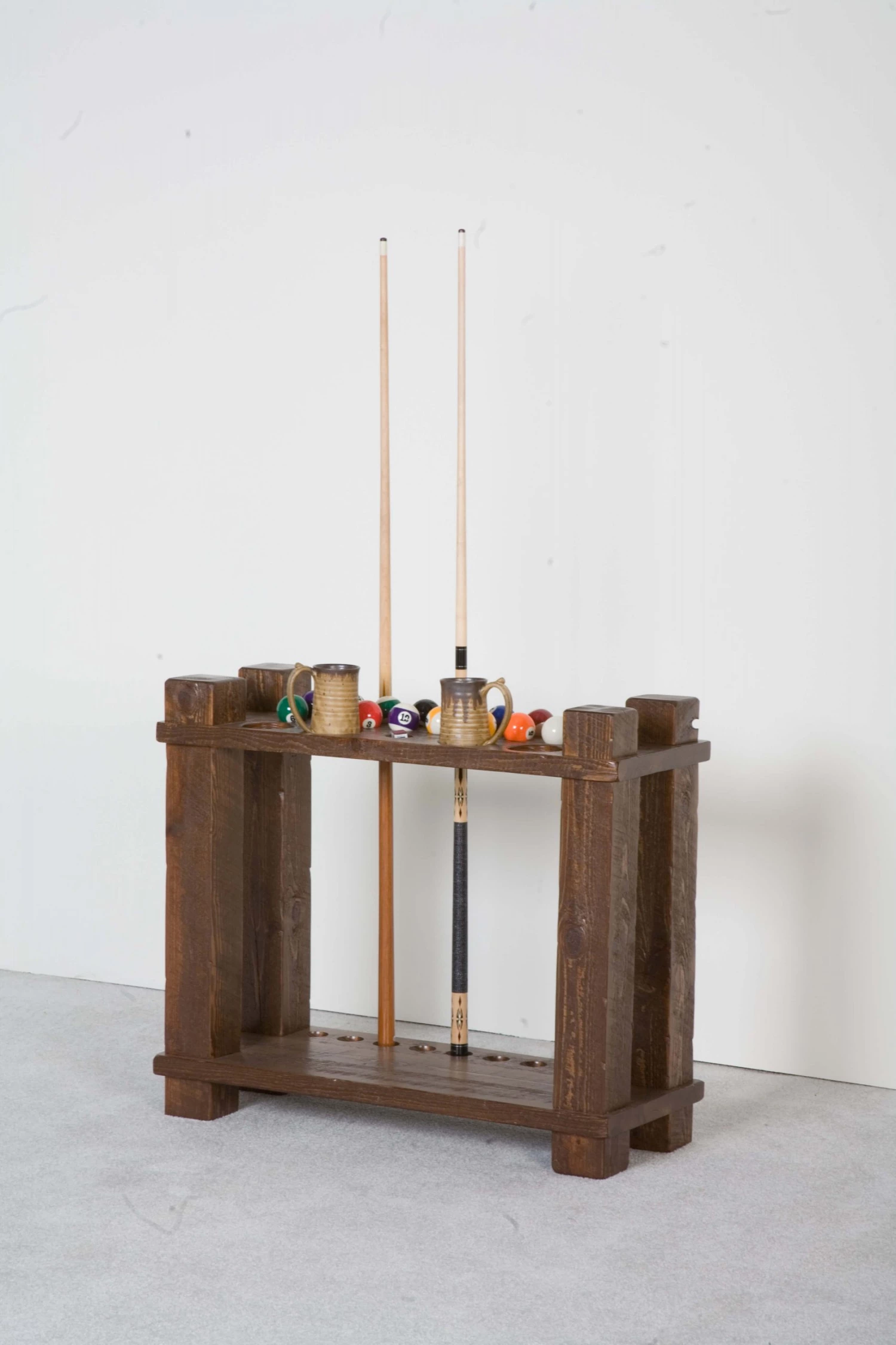 The barn wood floor cue rack will match any rustic barnwood billiard table. It is made from solid rough sawn pine, and it’s our widest cue rack we offer. This rustic floor cue rack has multiple unique features including four drink holders with cork inserts, and it’s built to hold billiard balls, chalk, and up to eight cue sticks.