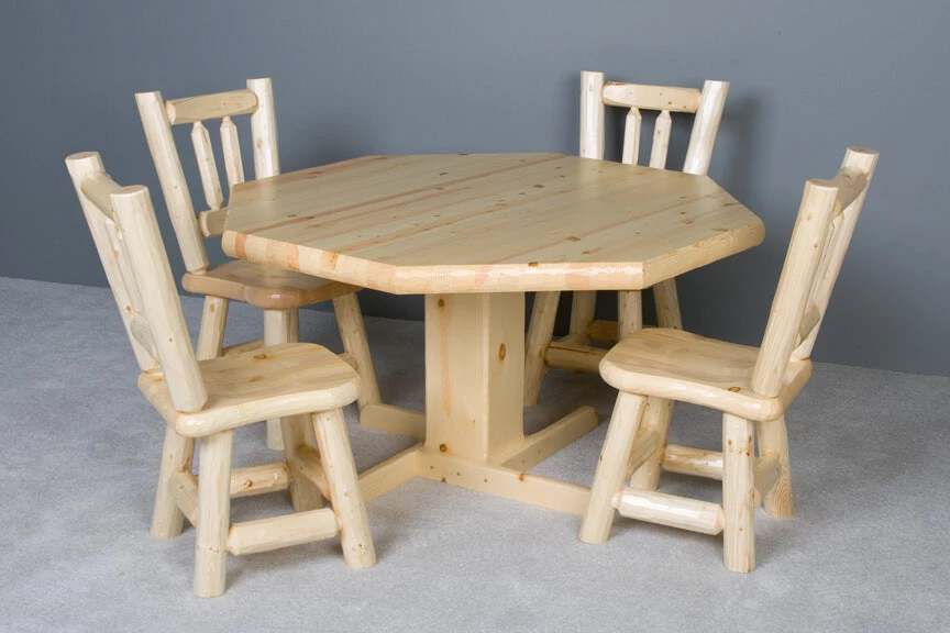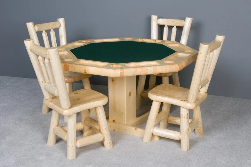 This is the ultimate log poker table because it’s beautifully made to be multi-functional. The rustic poker table top can be used as the card table, or it can be used as a dining table. The warmth of the Ponderosa pine is carried throughout the table in the cup holders and chip trays. This log poker table has eight cup holders and chip trays incorporated into its octagon shape. The outside edge is hand hewn using a drawknife to create the rustic look. When you are not using the rustic poker table, just use the reversible top to convert it into a rustic dining room table.