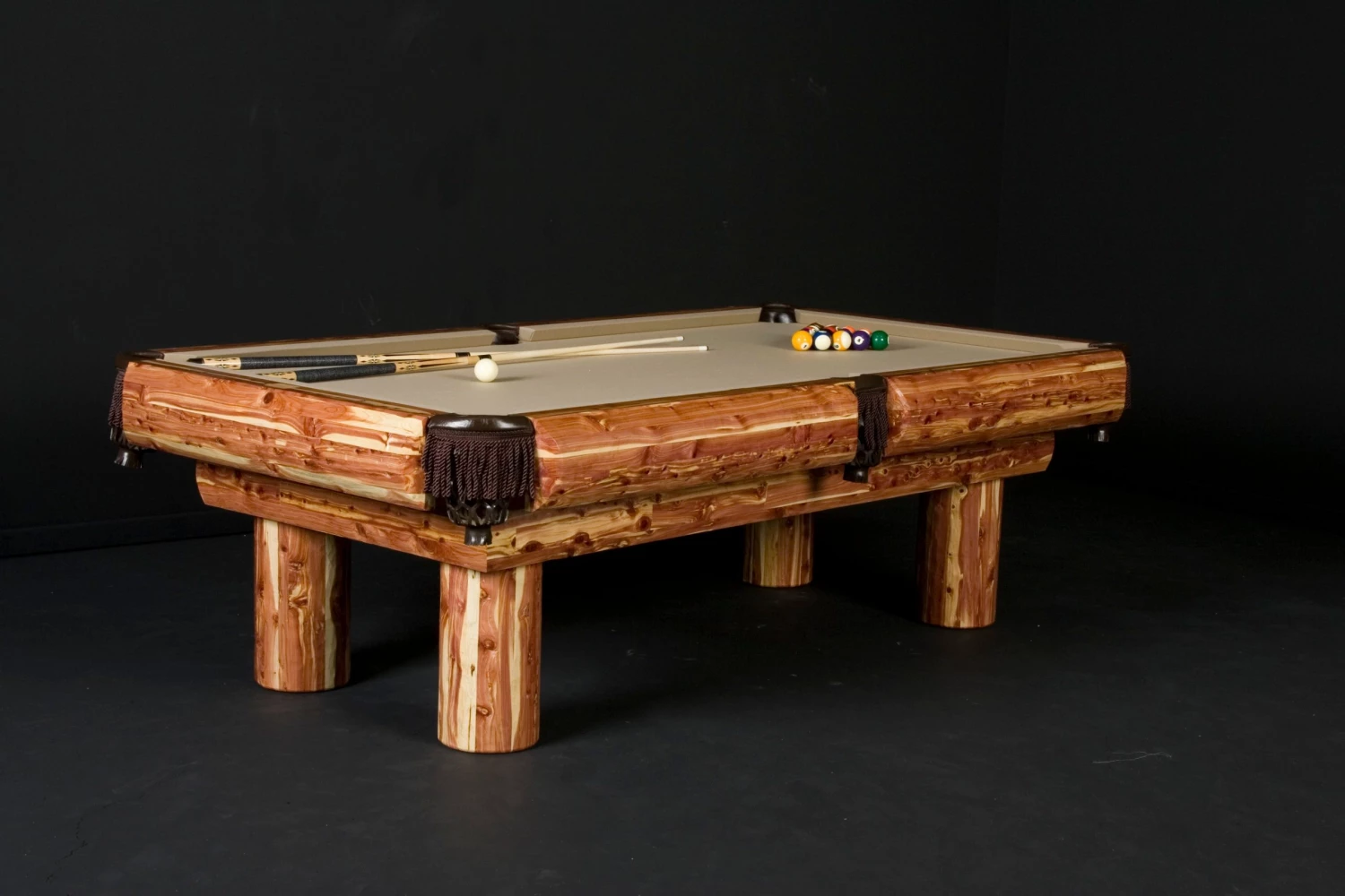 The red cedar log pool table mirrors the Ponderosa except it is constructed of premium, aromatic red cedar. Let this rustic pool table be the center of your game or rec room. Each piece is hand hewn using a drawknife to scallop the edges for a rustic billiard table look. The deep reds and whites of the cedar, along with the knots, truly display the rustic character of this red cedar pool table. You must see this rustic pool table to truly appreciate its beauty and flawless design!