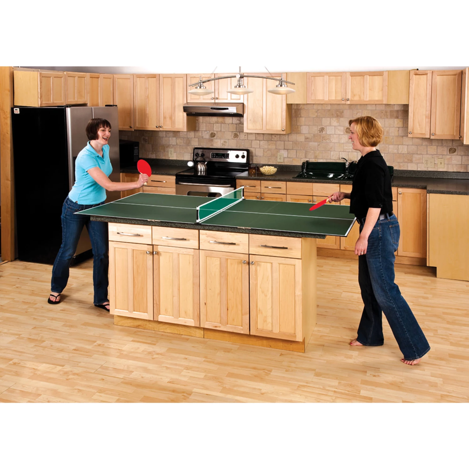 - Easy to set up and converts anything into a table tennis table, including kitchen islands, pool tables, air hockey tables or even a table saw!